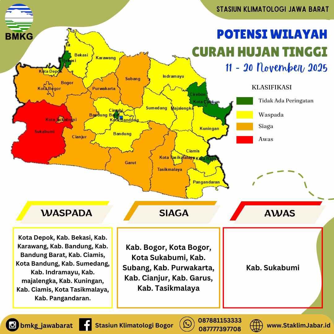 Kondisi tersebut membuat BMKG menetapkan status “Awas” bagi Kabupaten Sukabumi, karena diprakirakan mengalami curah hujan di atas normal yang berpotensi memicu banjir, longsor, genangan air, hingga angin kencang.